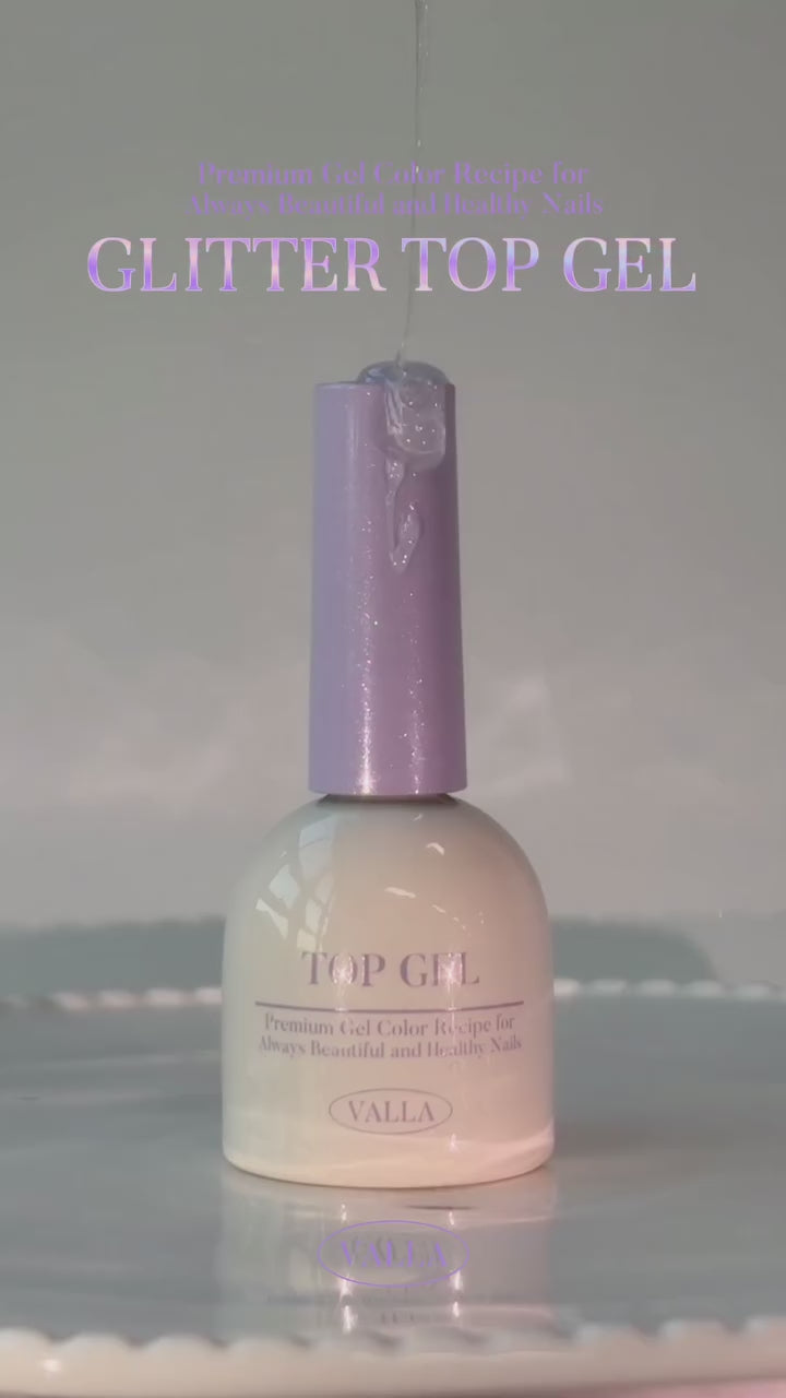 VALLA Non-Wipe Glitter Top Gel is a clear top gel with fine pink-lilac glitter for a soft, luminous finish. It adds a subtle sparkling effect over color gels and nail art while keeping application fast and convenient with a non-wipe finish.